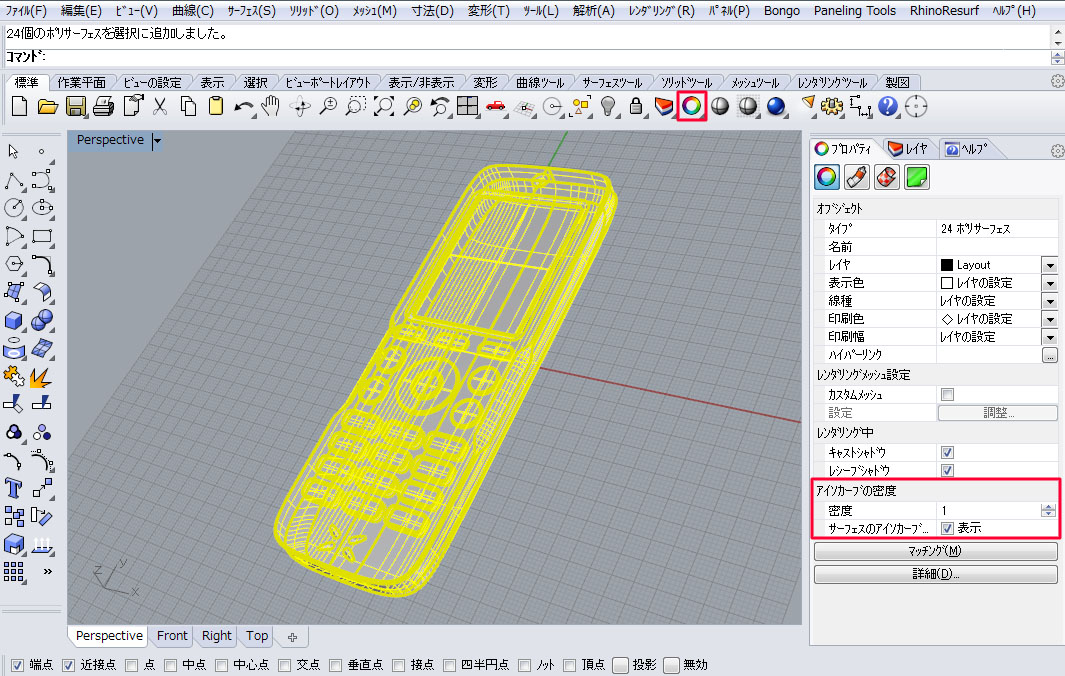“アイソカーブの密度”の欄で”表示”のチェックを外せば、通常のシェーディング時にもサーフェス表面のアイソカーブが非表示の状態になります。
