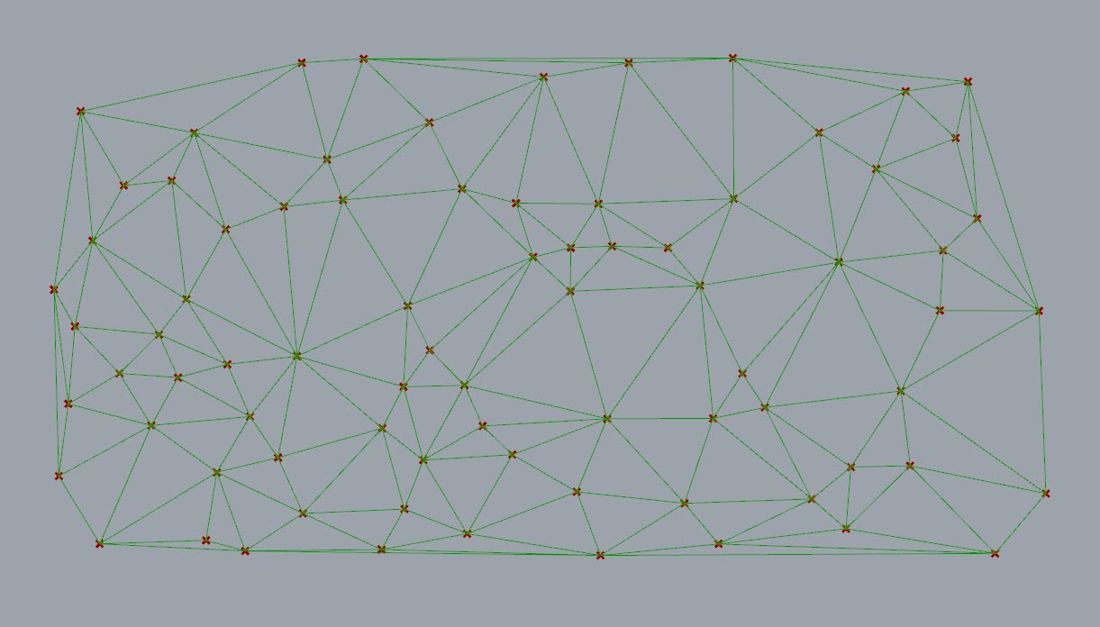 Grasshopperで投影するドロネー図を用意します。ドロネー図はGrasshopperでコンポーネントが用意されていますので、ランダムで発生させた点から作成します。