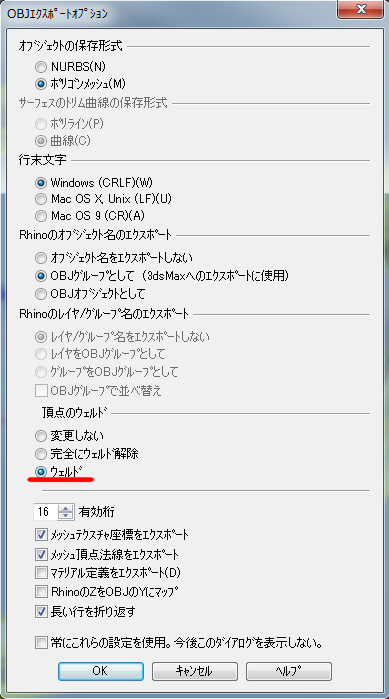 Rhinocerosからobjをエクスポートする際に出るオプションで”頂点のウェルド”という項目があります。