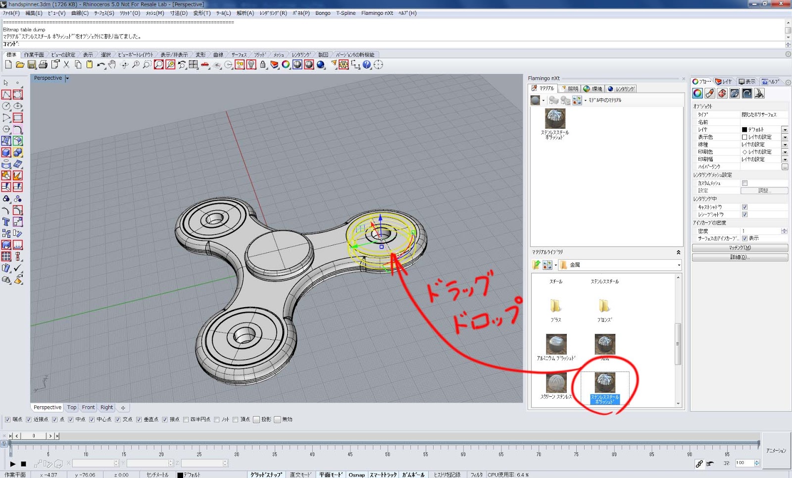 こんな感じで、ドラッグドロップするだけで、簡単にマテリアルを割り当てる事ができます。簡単ですね。(初夏のハンドスピナー♪)