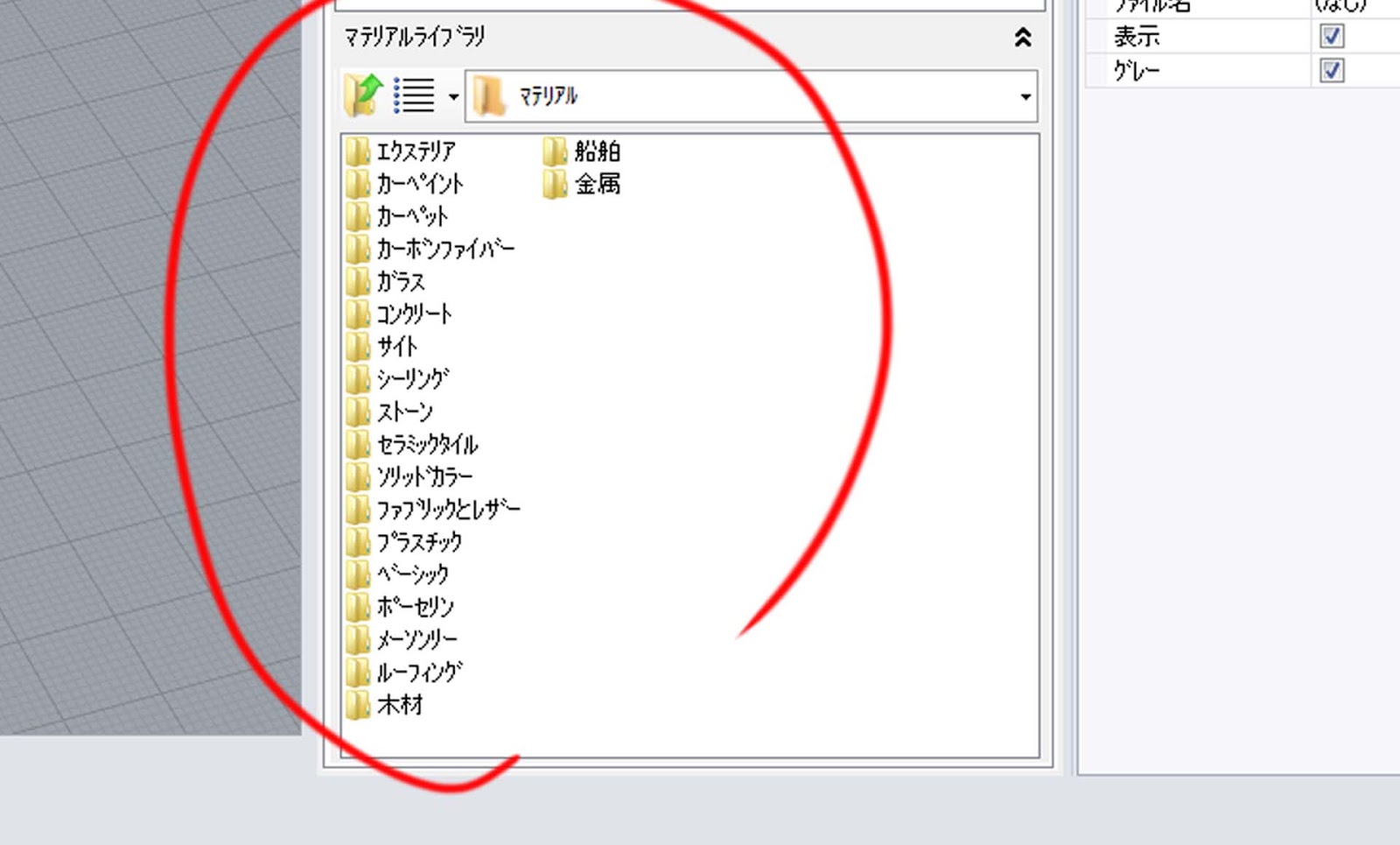 マテリアルライブラリは20項目に分かれてます。さらに各項目を開くと、中に素材ごと・色ごとにマテリアルが入っています。