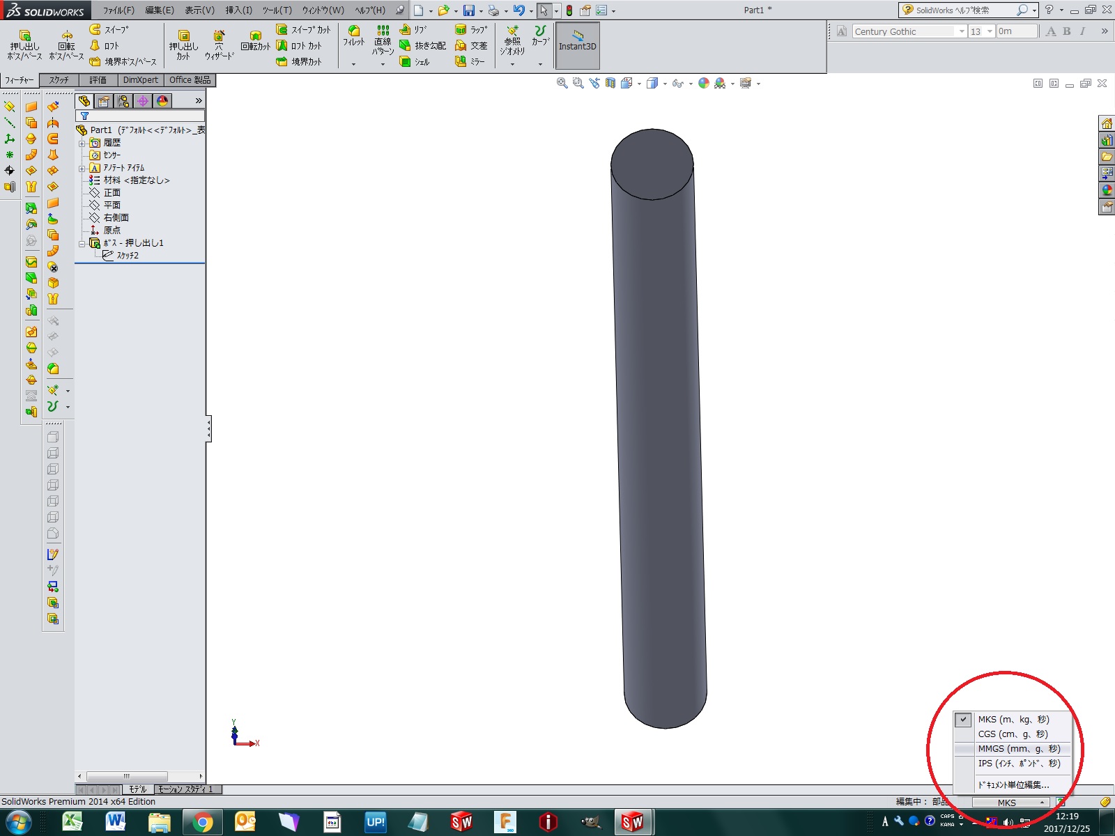 特別ややこしい操作ではありません。上図の右下あたり、赤丸で囲った所に、現在使用中の単位系が表示されています。この例では、MKS(m, kg, sec)が使われています。