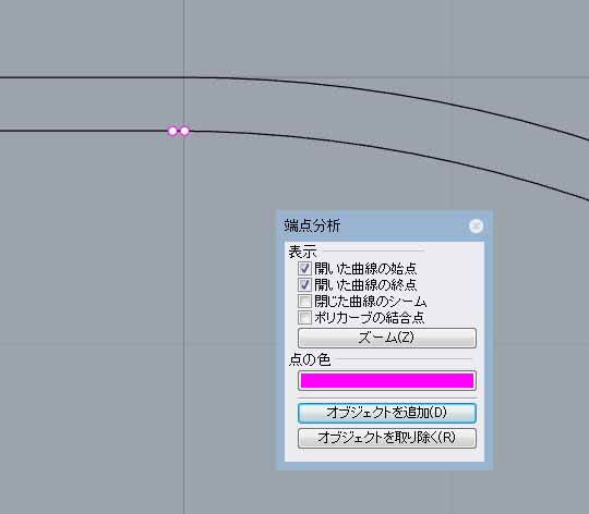 実行してみると、端点分析というウインドウが現れます。この中の開いた曲線の始点・終点にチェックを入れると、曲線のどこが開いているかを表示してくれるようになります。
