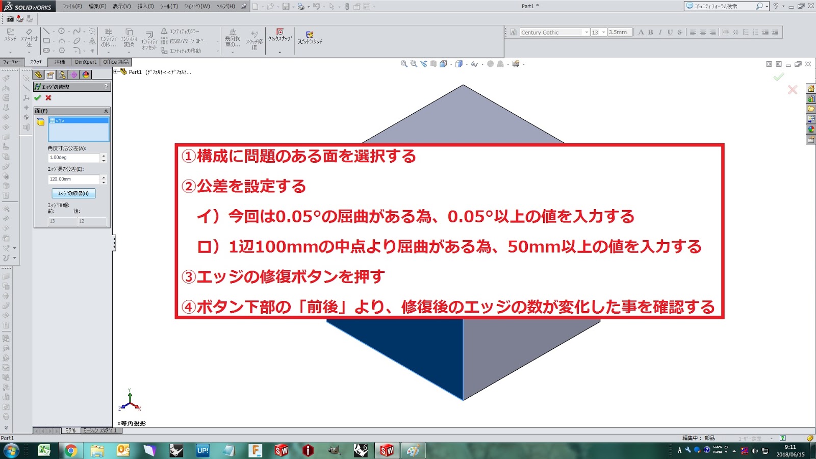 問題のある面を選択します。次に公差を設定します。今回の例では、角度を0.05°、エッジの長さを50mm以上に設定します。公差を入力したら、「エッジの修復」ボタンをクリックすることで、「前後」の窓に修復後のエッジの数が表示されます。例では、エッジの数が1本減っている事が確認できます。