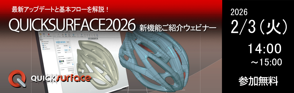 弊社取り扱い製品「QUICKSURFACE」の最新バージョン「QUICKSURFACE 2026」 のリリースに伴い、新機能・アップデート内容をご紹介するオンラインウェビナーを開催します。本ウェビナーでは、強化された主要機能の解説とあわせて、リバースモデリングの基本フローを分かりやすくご紹介します。
